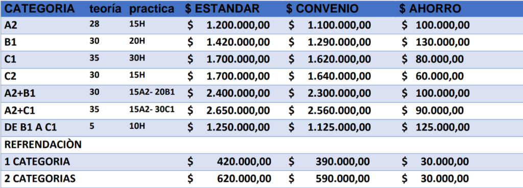 Tarifas especiales en licencias de conducción A2-B1-C1-C2-C3 y y sus cursos complementarios